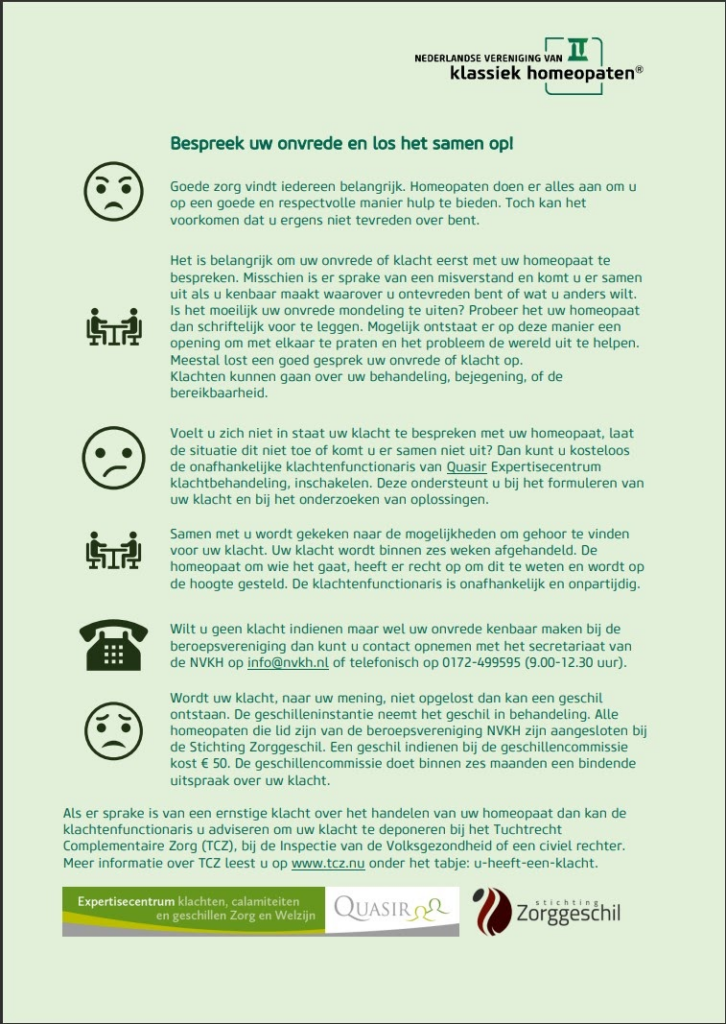 Mocht u ontevreden zijn over wat dan ook, bespreek het dan alstublieft eerst met mij. Ik sta open voor al uw gedachtes en zal er alles aan doen om een oplossing te vinden. Mocht het daarna toch voorkomen dat wij er samen niet uitkomen, bekijk hieronder wat u kan doen: